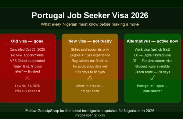 If you have been planning to relocate to Portugal using the popular Job Seeker Visa, stop and read this first. There has been a major change that affects every Nigerian planning to use this route — and most people don’t know about it yet. MyGossipShop brings you the full truth, no sugar coating. ❌ The…