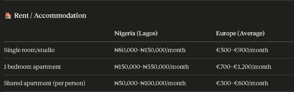 The reality: Most Nigerians arriving in Europe start with shared accommodation to survive. A full apartment alone is a luxury for the first 1–2 years.
