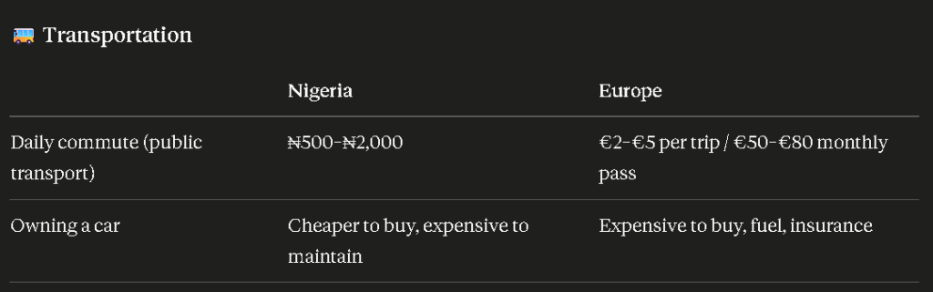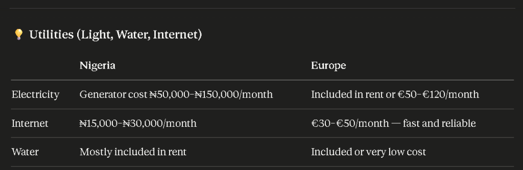 The reality: This is where Europe wins clearly. No generator. No NEPA drama. Light is on 24 hours. Internet is fast. These savings on stress alone are priceless for many Nigerians.