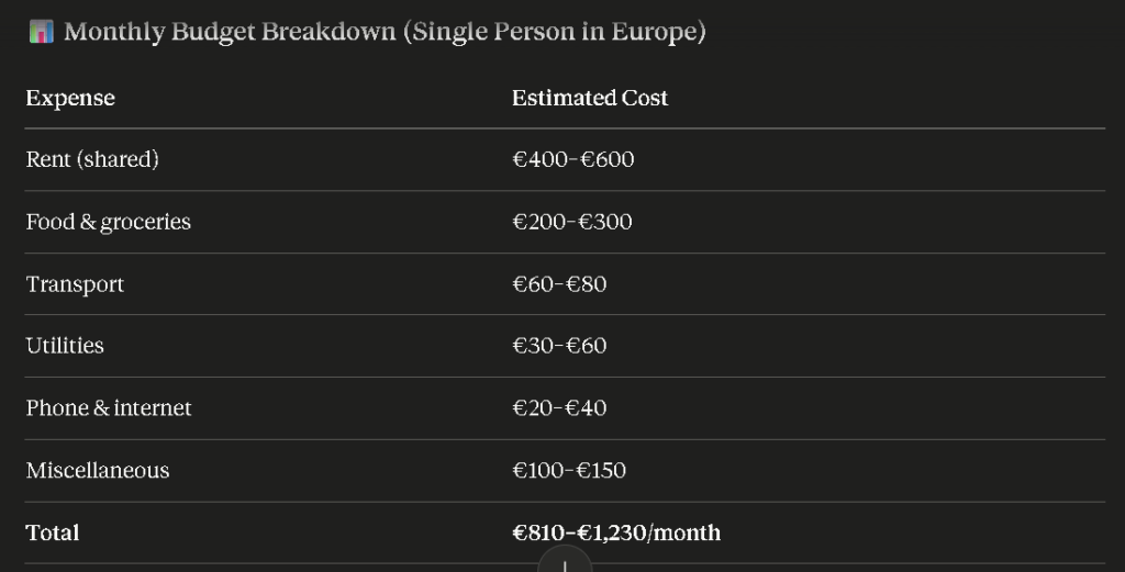 A single person needs roughly €1,000–€1,300 per month to live modestly in most European cities. More in cities like London, Paris or Amsterdam.